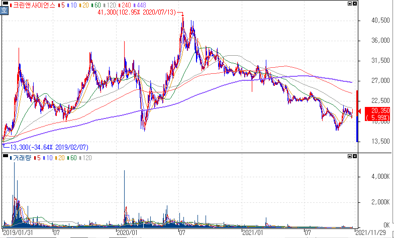 장기 우상향 차트곡선을 그리다 2020년 최고점을 찍고 지속 하락하고 있는 주식인데요, 최근 미세먼지 관련 이슈로 하락추세를 멈추려고 하는 모양이 나오고 있습니다. 크린앤사이언스도 미세먼지 이슈가 나올때마다 오를 수 있는 종목으로