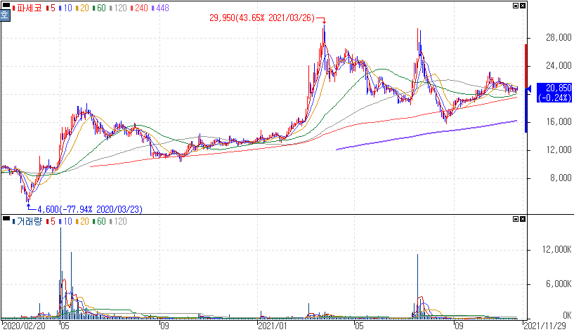 수년간 지속 우상향의 모습을 가져온 파세코이지만 2021년 3월26일최고점 찍고 주가는 계속 약세를 보이고 있습니다.