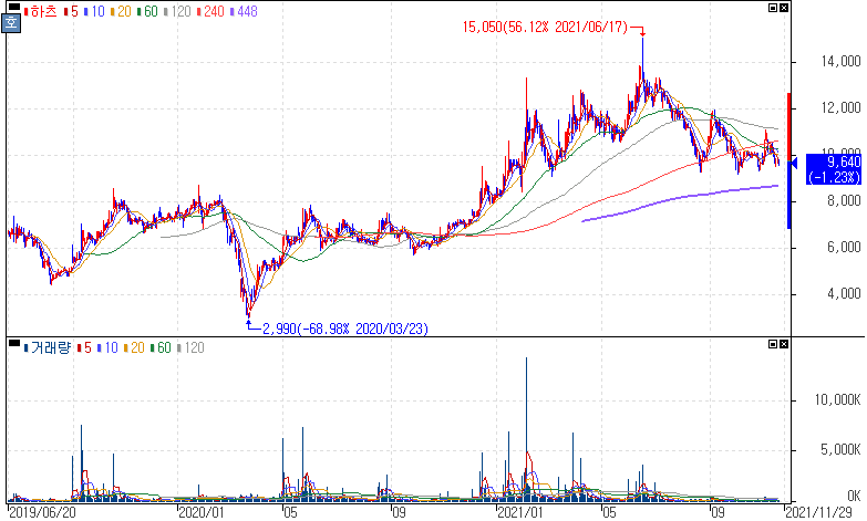 차트는 240일선과 448일선 사이에 쓰리바닥을 다지며 일정가격 이하로 안내려오고 버티고 있습니다.